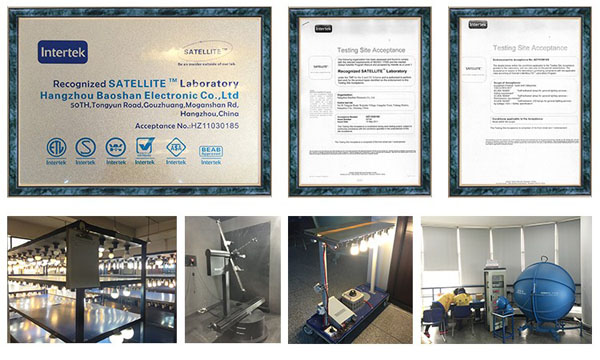 公司拥有自营出口权,产品已经获得UL、FCC、CE、EMC、GS、TUV、ROHS等多项国际标准认证。公司管理已经通过了ISO9001:2008质量管理体系认证,并不断提升与精细化管理。为提高公司产品的国际竞争力,满足客户日益提升的性能安全标准,以及各国强制性标准及指令不断出台,公司于2010年5月份建立了一个国家认可的(CNS)标准化检测实验室-杭州宝山电光源有限公司ITS实验室,经实验室亚太区总部验收及发证,可做各项专业的安全性能测试。